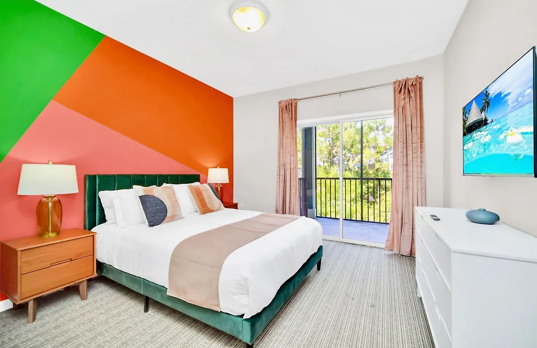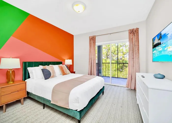 La villa Modern 3BR Condo Near Disney- Pool&Hot Tub está equipada con una cocina bien equipada con tetera, nevera y cristalería. Los huéspedes pueden llegar fácilmente al aeropuerto Internacional de Orlando, situado a 43 minutos en coche del establecimiento.